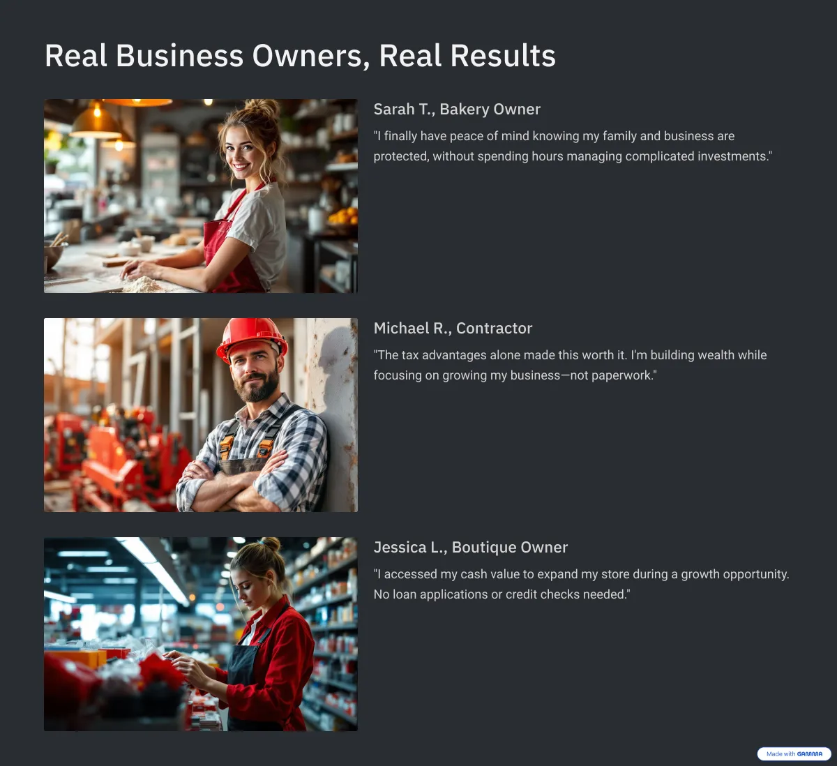 Answer a brief questions book a Chat No complicated financial talk—just clear answers about how this can specifically help your business and family.